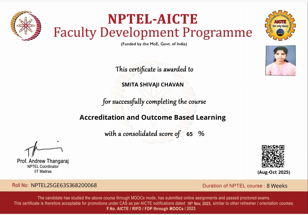 Ms. Smita Shivaji Chavan has successfully completed the NPTEL–AICTE Faculty Development Programme (FDP) on “Accreditation and Outcome Based Learning”, conducted during August–October 2025.
