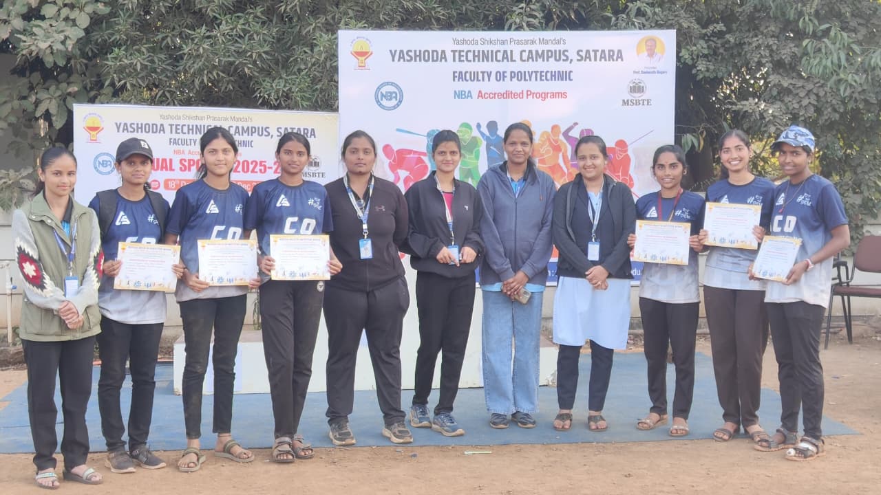 Yashoda Technical Campus, Faculty of Polytechnic, proudly congratulates the Girls’ Kabaddi Team of the Department of Computer Engineering for winning the Kabaddi Championship in the Annual Sports Competition 2025–26. The team delivered an inspiring performance throughout the tournament, showcasing strength, agility, tactical skills, and excellent teamwork.