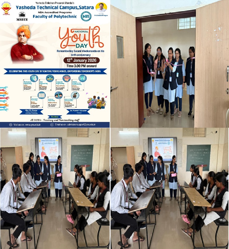 The Electrical Engineering Students’ Association (EESA), Department of Electrical Engineering, Yashoda Technical Campus, Satara, organized National Youth Day Celebration on 12/01/2026 as per the institute academic calendar. The program was arranged to commemorate the birth anniversary of Swami Vivekananda and to inspire students to follow his ideals and teachings.