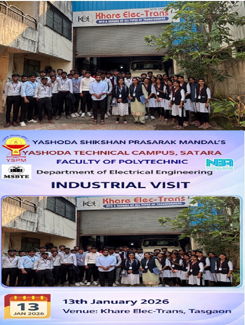 The Department of Electrical Engineering, Faculty of Polytechnic, YTC, Satara organized an industrial visit for Second Year (SY) and Third Year (TY) students to Khare Elec-Trans, Tasgaon on 13th January 2026. The main objective of this visit was to provide students with practical exposure to transformer construction, working principles, and maintenance practices used in the electrical industry.